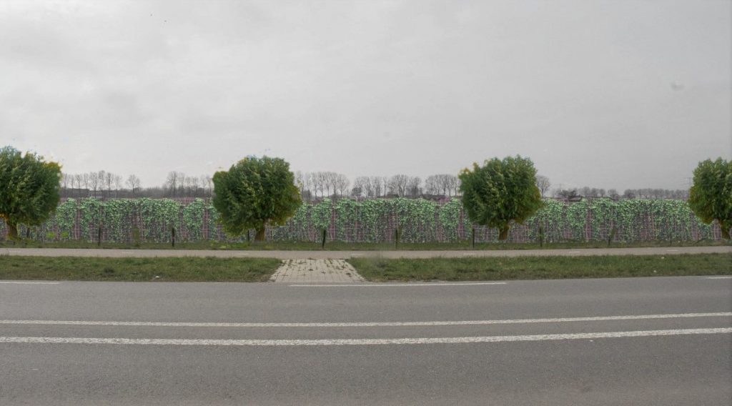 - Het hekwerk aan de oost- en westzijde zal op sommige plaatsen begroeid worden. Voor het hekwerk wordt een zone ingezaaid met kruidenrijk grasland waar tevens knotwilgen geplaatst worden;