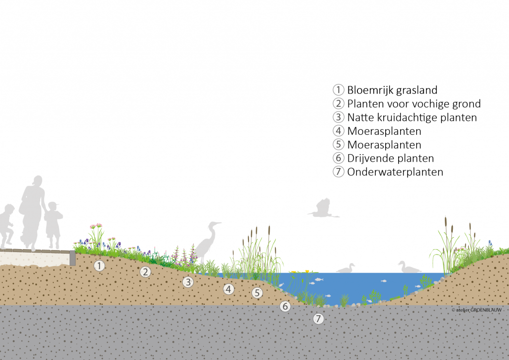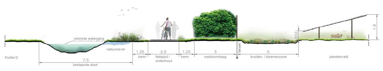 - Verbreding van bestaande sloot en aanleg van een brede natuurlijke wateroever langs gehele zuidzijde met een breedte van 7,5 meter