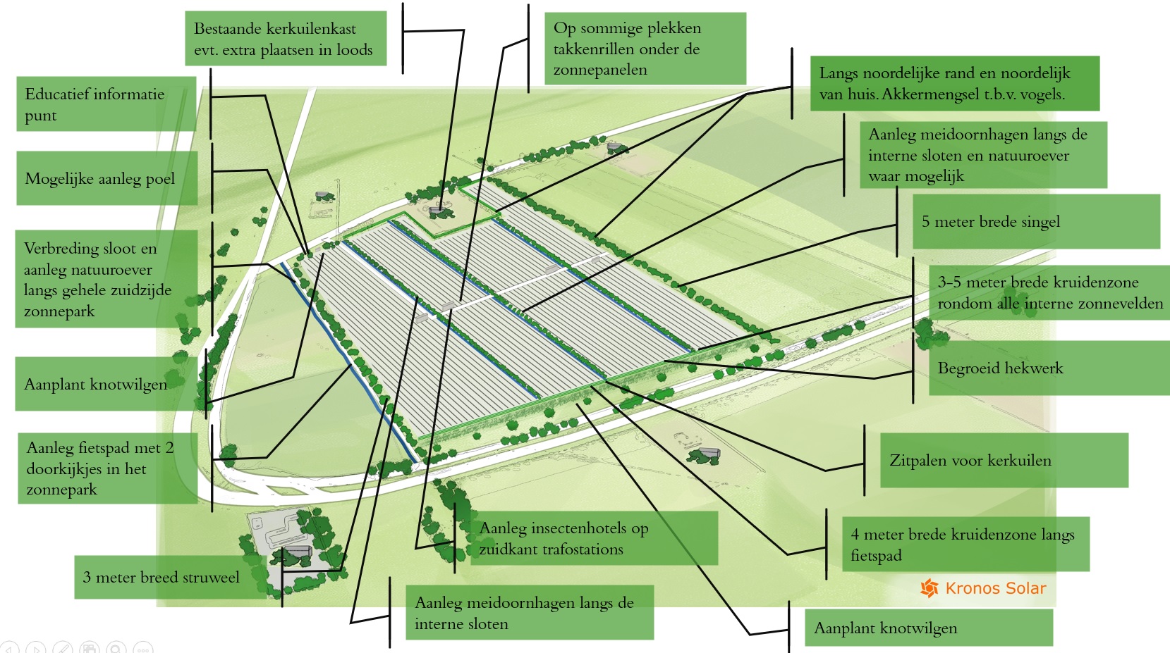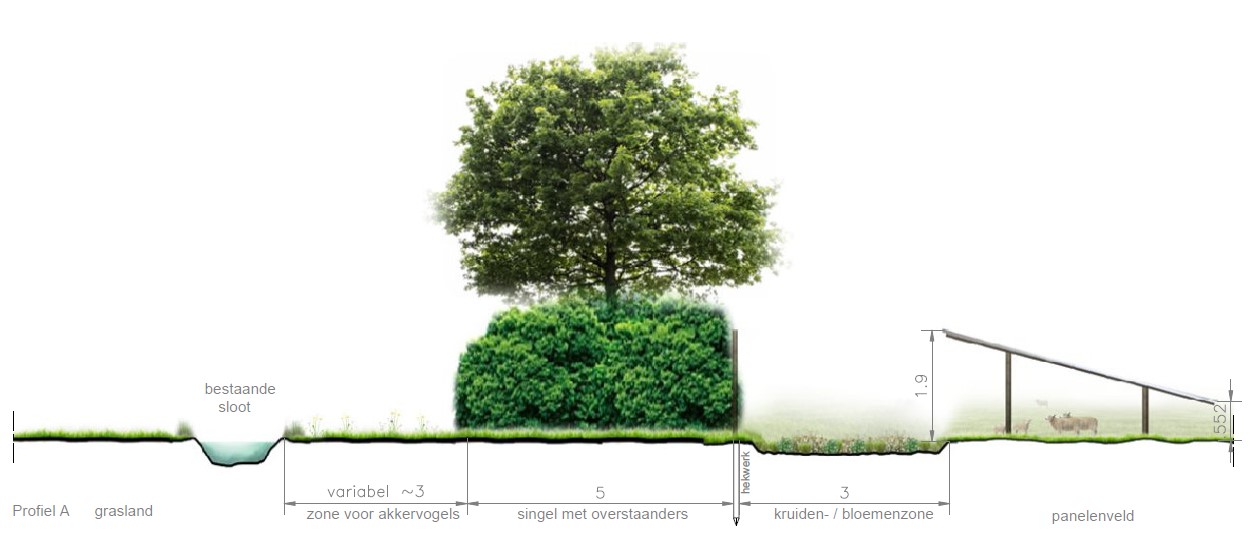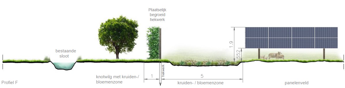 - Aan de noordzijde van het zonnepark, ten noorden van de singel, zal een strook worden ingezaaide met een akkermengsel t.b.v. bijvoorbeeld de patrijs. Het type mengsel wordt in samenspraak met gemeente en eventueel Cruydthoeck gekozen;