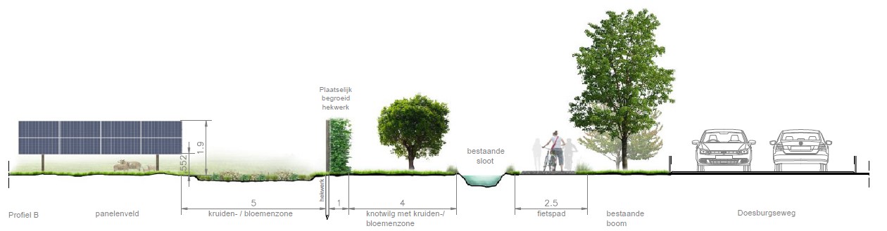 Aan deze zijde van het park kan door het aanleggen van beplanting ervoor gezorgd worden dat het zonnepark niet meer zichtbaar is. Deze beplanting wordt struweel genoemd. Wanneer dit niet gepland zou worden, zouden de achterkanten van de zonnepanelen zichtbaar zijn. Tussen deze struweelhaag en de zonnepanelen zal een kruiden of bloemenzone aangelegd worden.