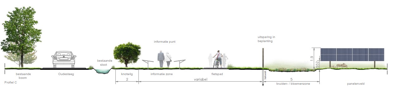 - Aan de zuidwest hoek van het zonnepark wordt een inkijk mogelijkheid gegeven met informatieborden omtrent het park. Geheel zuidelijk loopt vervolgens van west naar oost een fietspad wat onderdeel van een grotere fietsroute vanuit bijvoorbeeld Didam of Zevenaar kan worden. Zo wordt niet enkel Oud Zevenaar recreatief aantrekkelijk maar ook het landschappelijke karakter van noord Zevenaar. Langs het fietspad komen twee inkijkjes in het zonnepark.